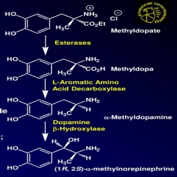 | 降壓作用 | α2 agonist; 經decarboxylation成dopamine再Hydroxylation成(1R,2S)α-methylnorepinephrine來活化α2抑制NE釋放產生降壓,且可取代NE而形成false transmitter(假的傳遞物) |