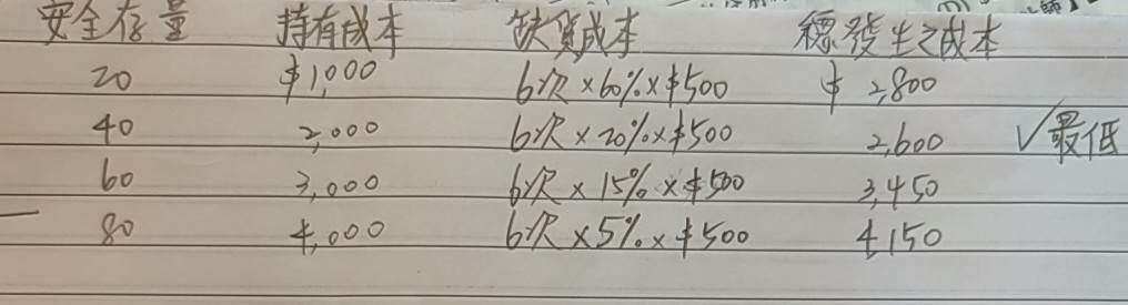 由上可知,安全存量在40的時侯相關成本最低,故選B