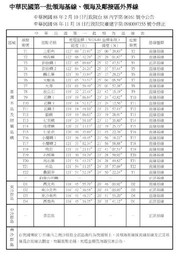 6 行政院於 88 年 2 月 10 日公告「中華民國第一批領海基線、領海及鄰接區外界線」 (民國 98 年 11 月 18 日