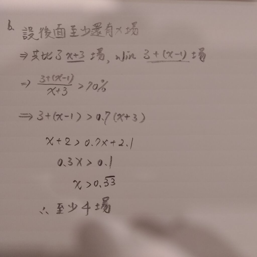 6.公司舉辦員工羽球賽。王先生已經比完的 3 場中贏了 2 場。如果接 下來的比賽中他只輸一場,勝率就能超過七成,請問接下來至少還 有幾場比賽?