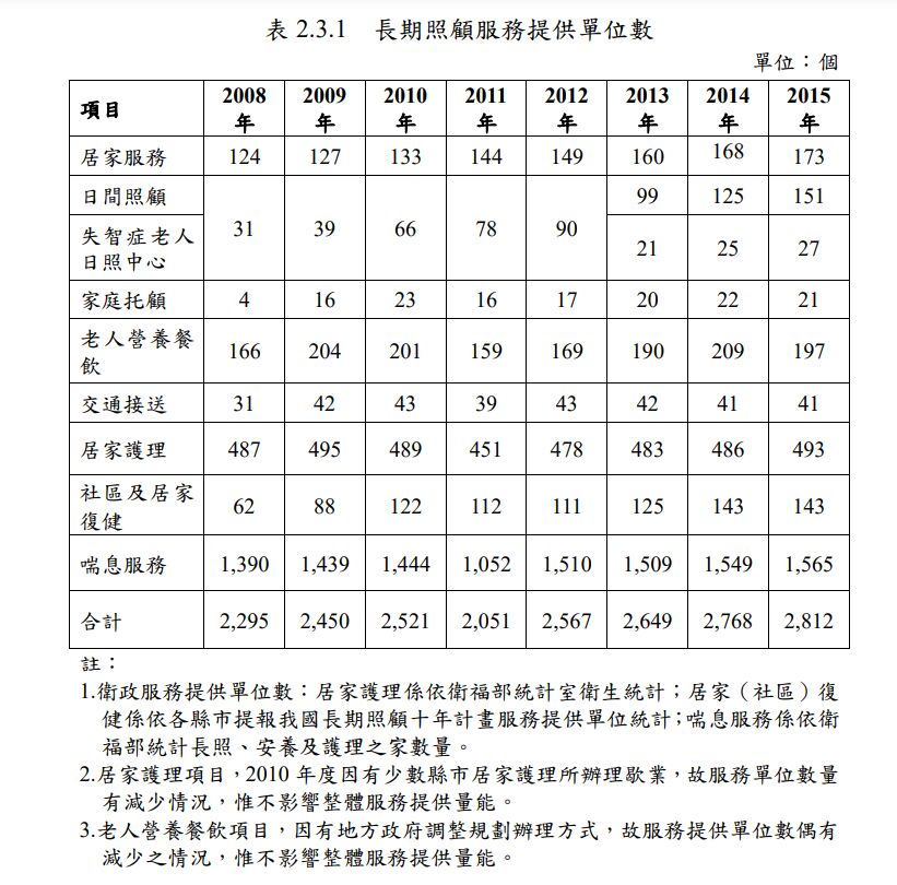 另衛政長照服務資源,2008年居家護理、居家(社區)復健、喘息服務項目之服務提供單位計1,939個,2015年計2,202個,8年內增加263個,約成長13.56%(詳如表2.3.1)。