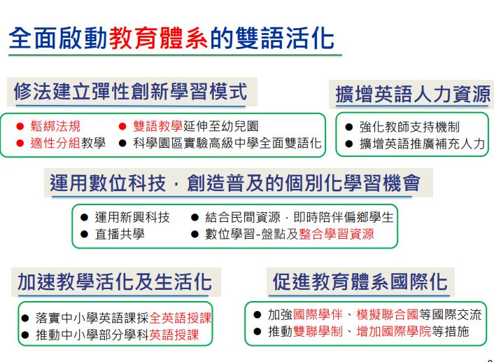 1. 全面啟動教育體系的雙語活化,包括修法建立彈性創新學習模式、加速教學活化及生活化、充實英語推廣人才、運用數位科技創造普及的個別化學習機會,以及促進教育體系國際化。
