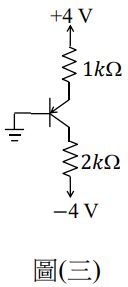 6. 如圖(三)所示之 PNP 雙極性電晶體(BJT)電路,假設其α= 0.99,VEB = 0.7 V,則 此電晶體工作在那一區?