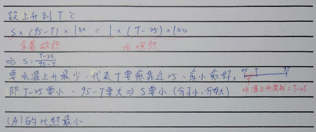 6. 將 100 g 溫度為 95 °C 的金屬置入 100 mL 溫度為 25 °C 的水中,下列何種金屬讓水溫上升最少? (金屬的比熱如下表)