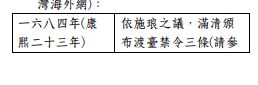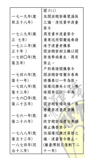 D) 攜眷渡臺禁令的置廢,可參考下表(臺 灣海外網