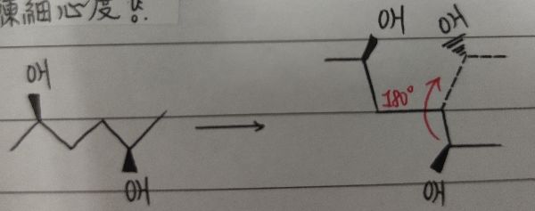 Meso compound為內消旋化合物,旋光性只有在同樣組成而互為R.S結構的化合物才會等值異號,此時才會消旋,內消旋為一個化合物自身具有此特徵,也就是此化合物若畫的出對稱面即屬之,5可靠固定上半部下半部隨意轉得對稱面,2.3更是,故選(D)。