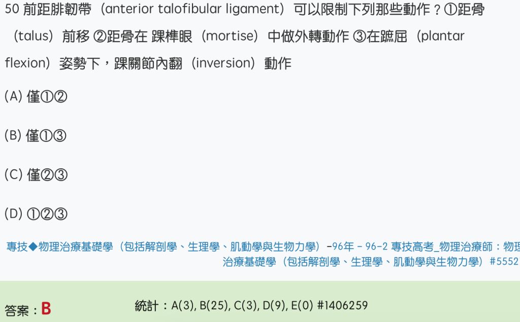 (D)後距腓韌帶(posterior talofibular ligament)最大張力發生在背屈合併內轉