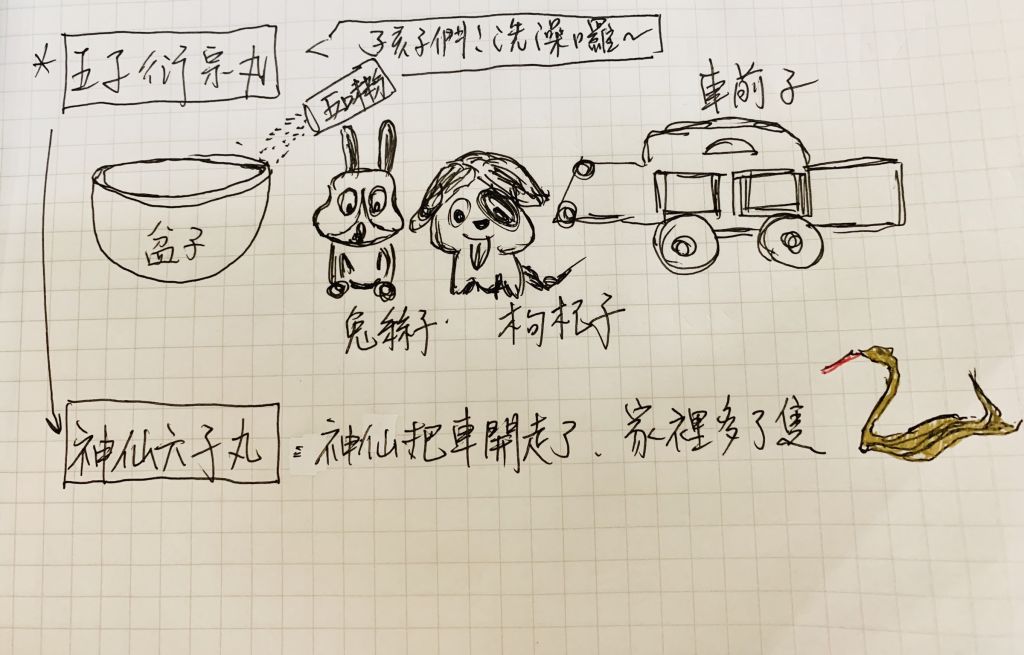 無聊畫的,五子衍宗丸就是家裡毛小孩在車庫洗澡的圖,他們用五味粉洗。神仙六子丸就是沒有車前子,多了一條金色的蛇(金鈴子、蛇床子)阿餒~