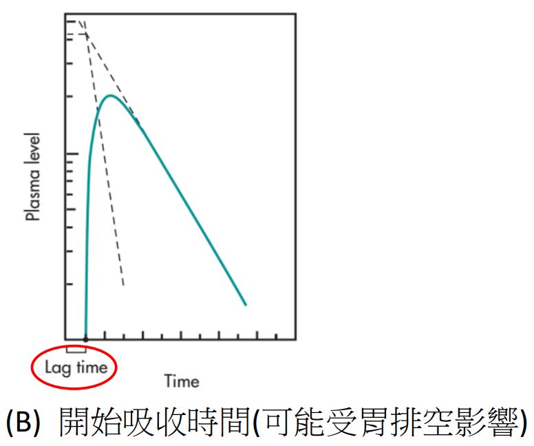 (B)滯後時間(lag time)一般是指投與藥物後,藥物血中濃度到達治療有效濃度的時間
