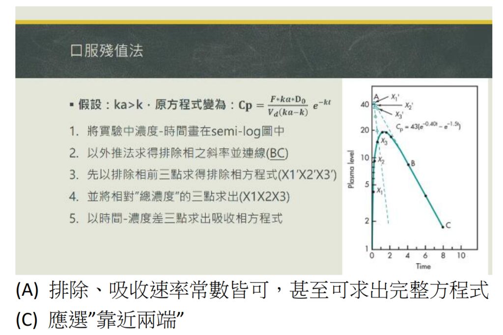 (A)殘值法(method of residuals)是利用口服後血中濃度數據,推估吸收速率常數的方法,但無法推估排除速率 常數
