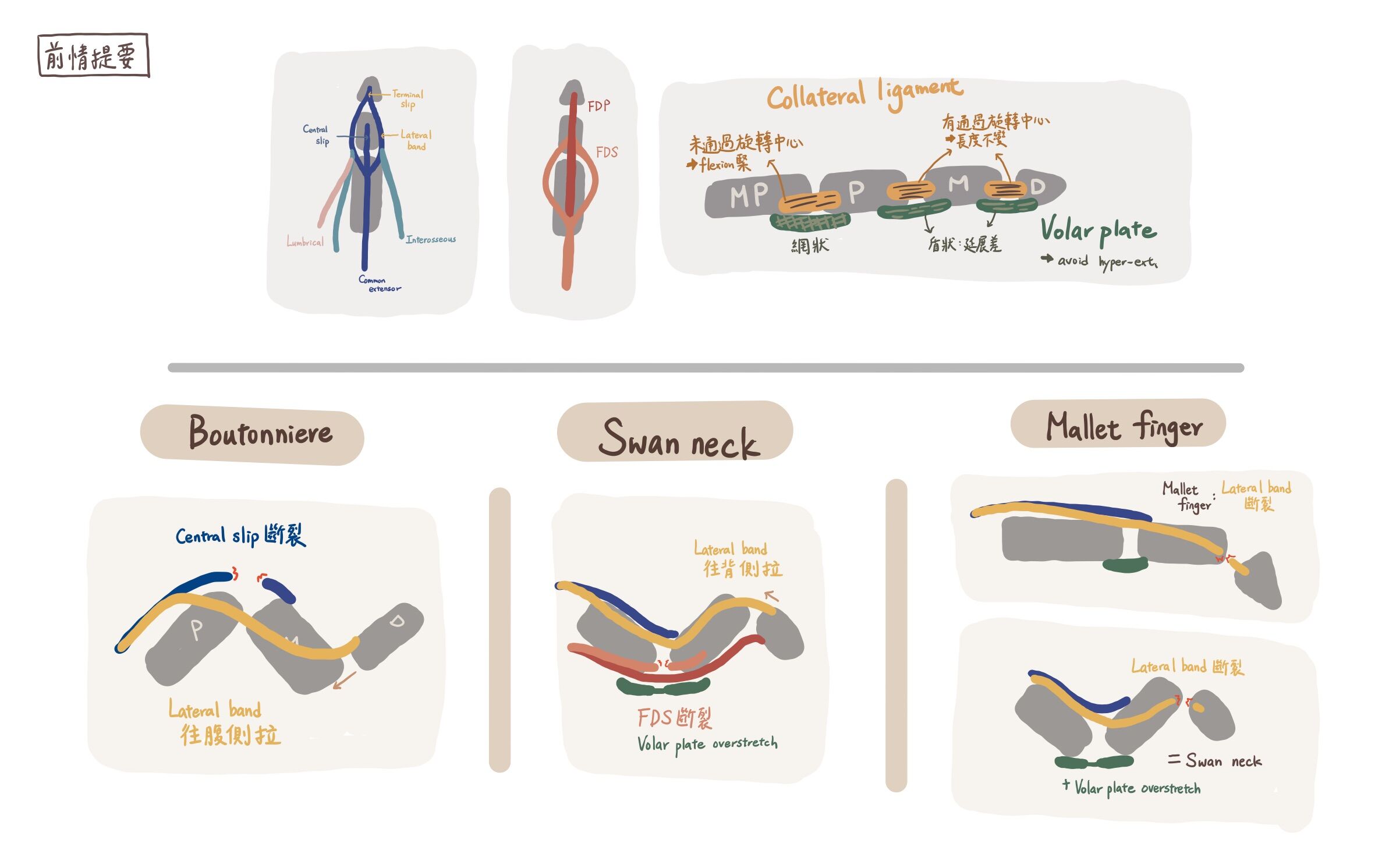 Zone1斷裂,因手指伸肌末梢肌腱斷裂,使DIP無法伸直