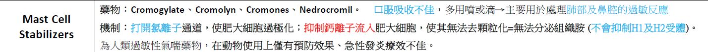 (D)Cromolyn拮抗肥大細胞第一型組織胺受體並打開鉀離子通道,使肥大細胞過極化