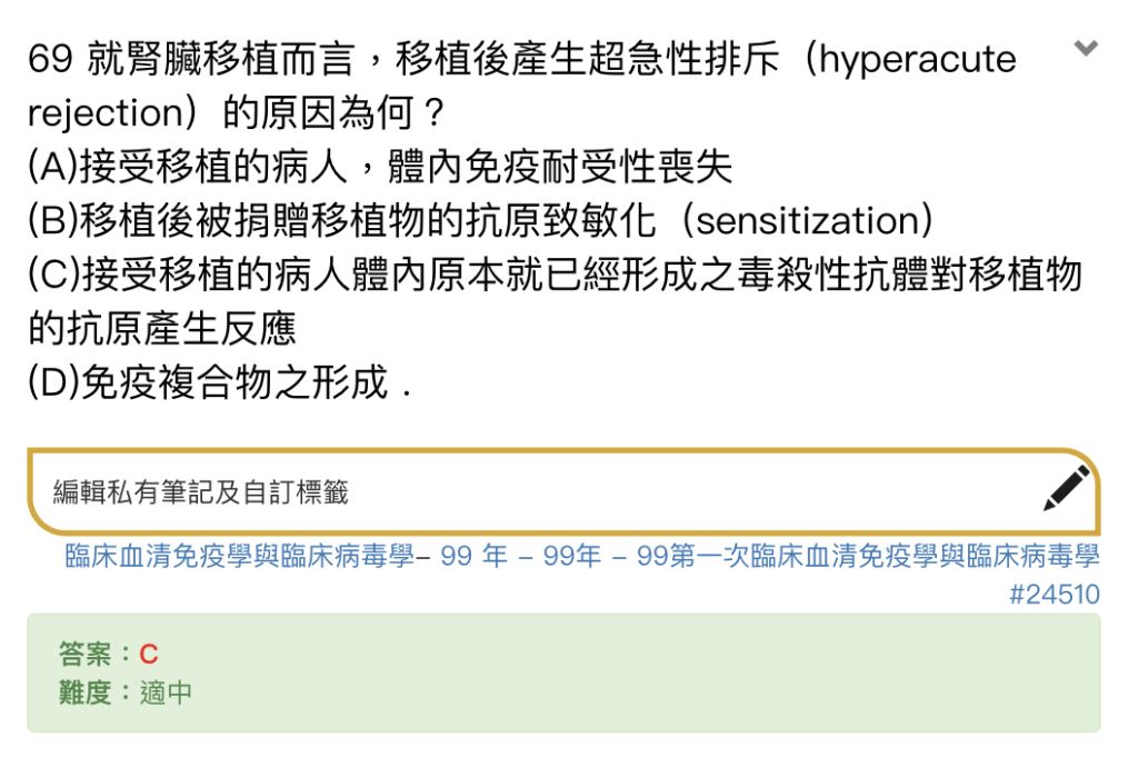(D)捐贈器官誘發第一型免疫過度反應