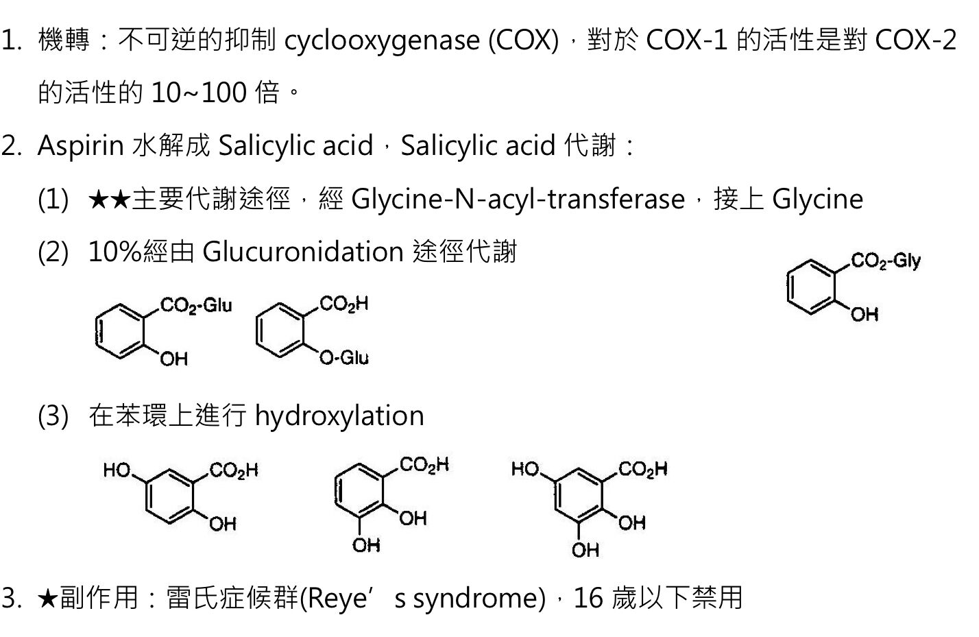 Aspirin 代謝要嘛coo接上Glycine或Glucuronudation要嘛在苯環上進行hydroxylation 不會像A選項OH接上COCH3