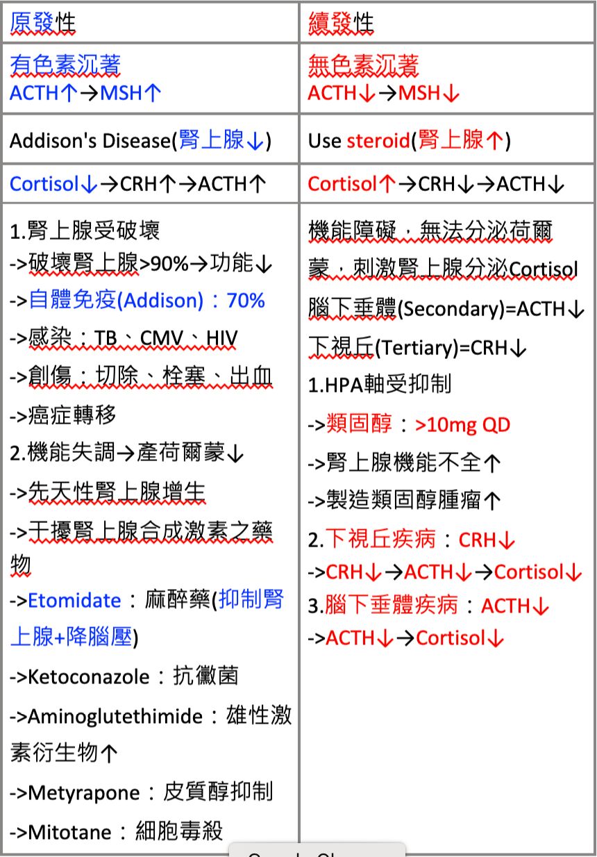 - 皮膚色素沈積(C):因為腦下垂體分泌大量 ACTH 嘗試刺激腎上腺,ACTH 與黑色素刺激素(MSH)有共同前驅物 → 導致皮膚色素沈積