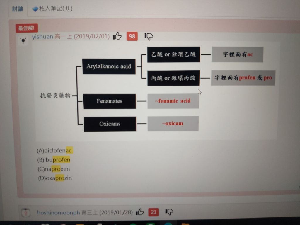 49.下列何者屬於acetic acids類藥品? (A)Diclofenac (B)Ibuprofen (C)Meclofenamate (D)Naproxen |