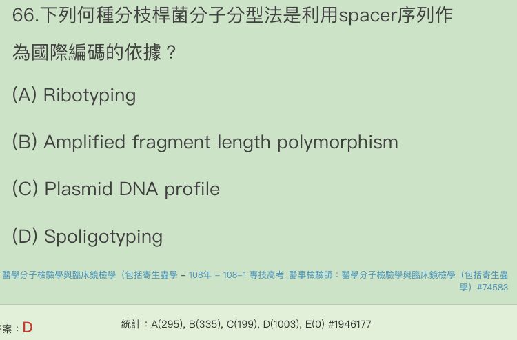69.Spacer oligotyping(spoligotyping)是常用於結核桿菌(Mycobacterium tuberculosis, MTB)分型的分子檢驗方