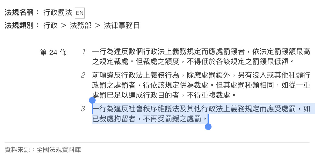 行政罰24第三項與釋字503無關,立法委員認為人身自由>財產權(吸收)。
