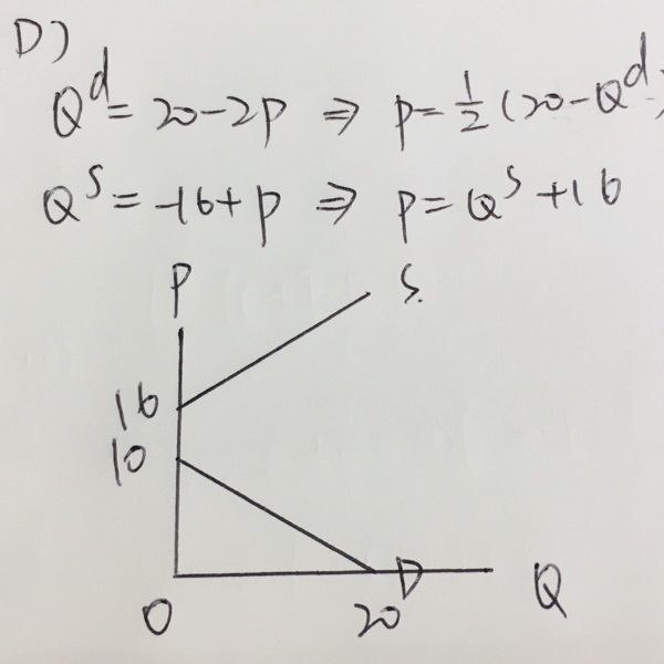 (D) Qd=20-2P,Qs=-16+P
