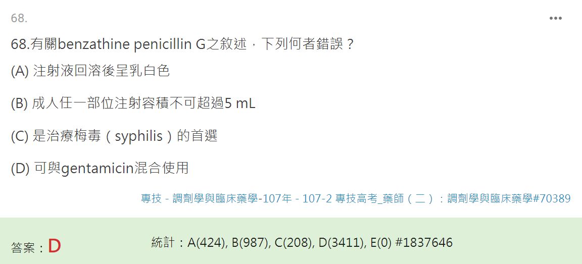 7.有關 penicillin G 用於治療成人早期梅毒(syphilis)的劑型與劑量,下列何者正確?