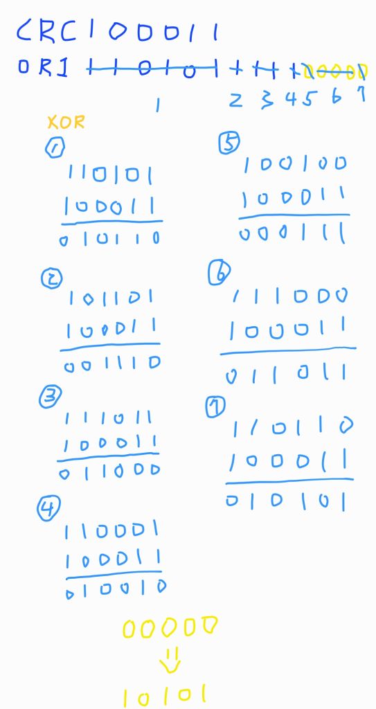 首先知道CRC生成式=100011,然後按照常識A和B是錯的因為壓根和原本資料不一樣。那麼就剩C和D了,直接拿一個來和100011做XOR長除法,沒有餘數的選項就是解答(或者你找到一個有餘數的選項,那另一個就是答案了)。