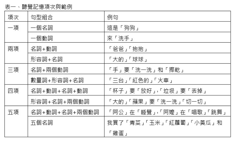 (C)施測或訓練時,在初期最好只使用詞彙或片語,等到孩子發展出兩項聽覺記憶後,再開始使用完整的句型
