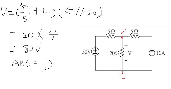 7. 試求下圖所示的直流電路中,跨於 20 歐姆的電阻器兩端之電壓為多少?