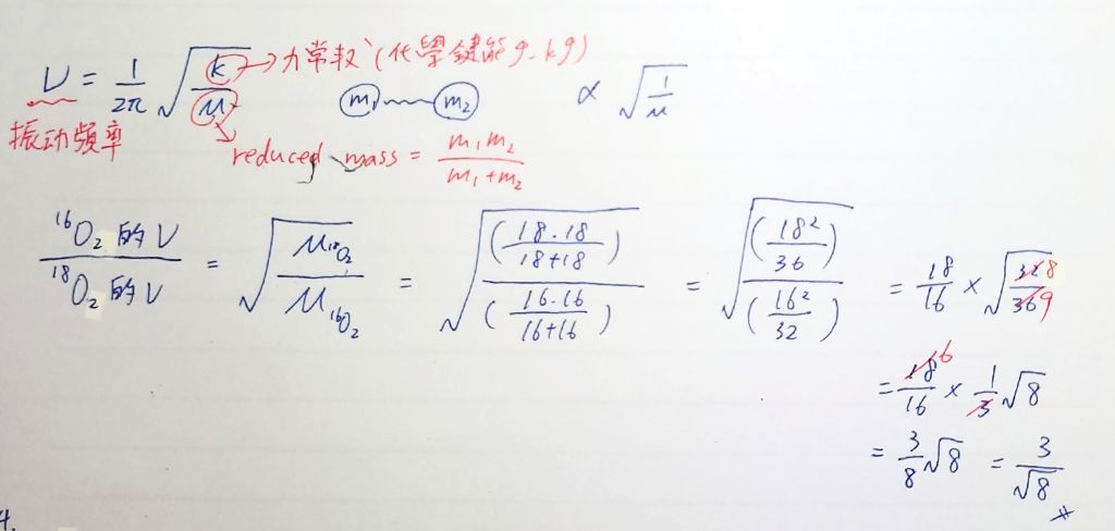 7. 若 16O2 振動的力常數(force constant)和 18O2 振動的力常數相同,則 16O2 和 18O2 的振動頻率比為