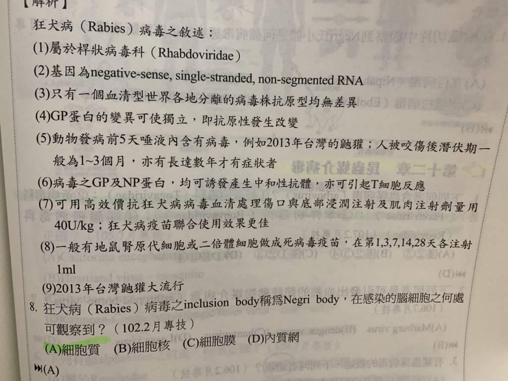 (B)受感染的神經細胞質內會出現嗜酸性的Negri body