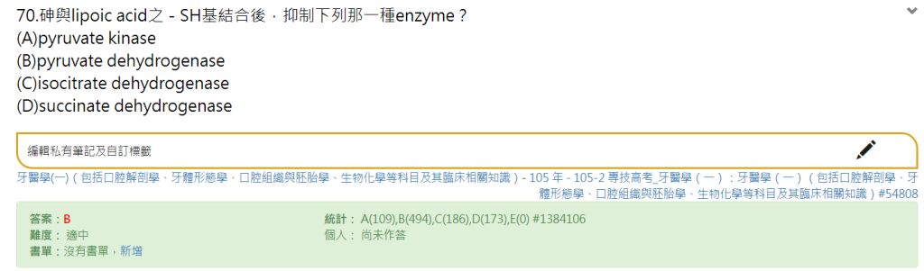 70.丙酮酸脫氫酶複合體(pyruvate dehydrogenase complex)內有五種輔酶,但不包括下列何者?
