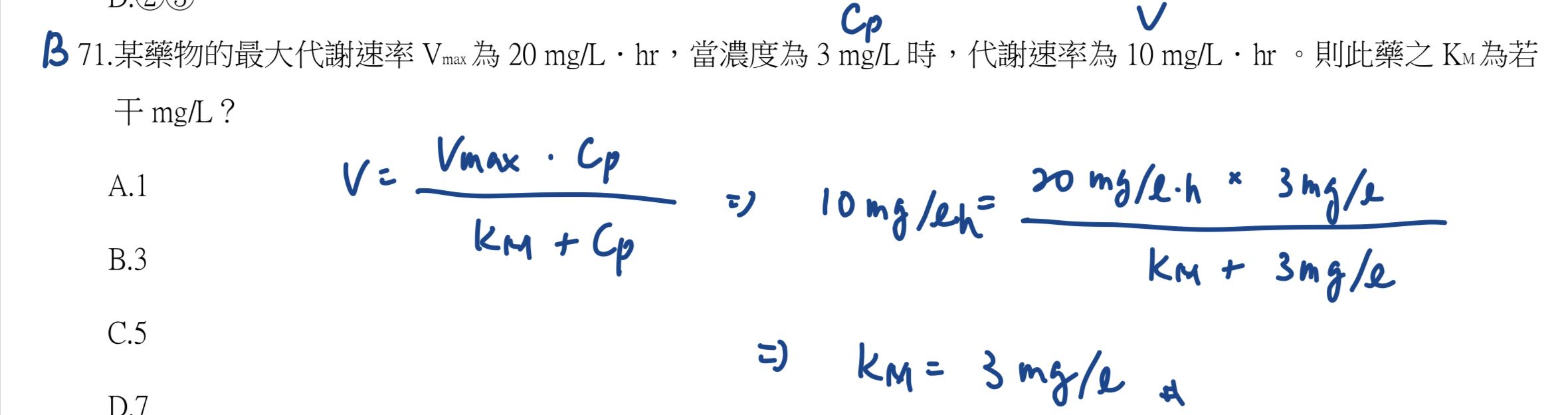 71.某藥物的最大代謝速率 Vmax 為 20 mg/L.hr,當濃度為 3 mg/L 時,代謝速率為 10 mg/L.hr 。則此藥之 KM 為若