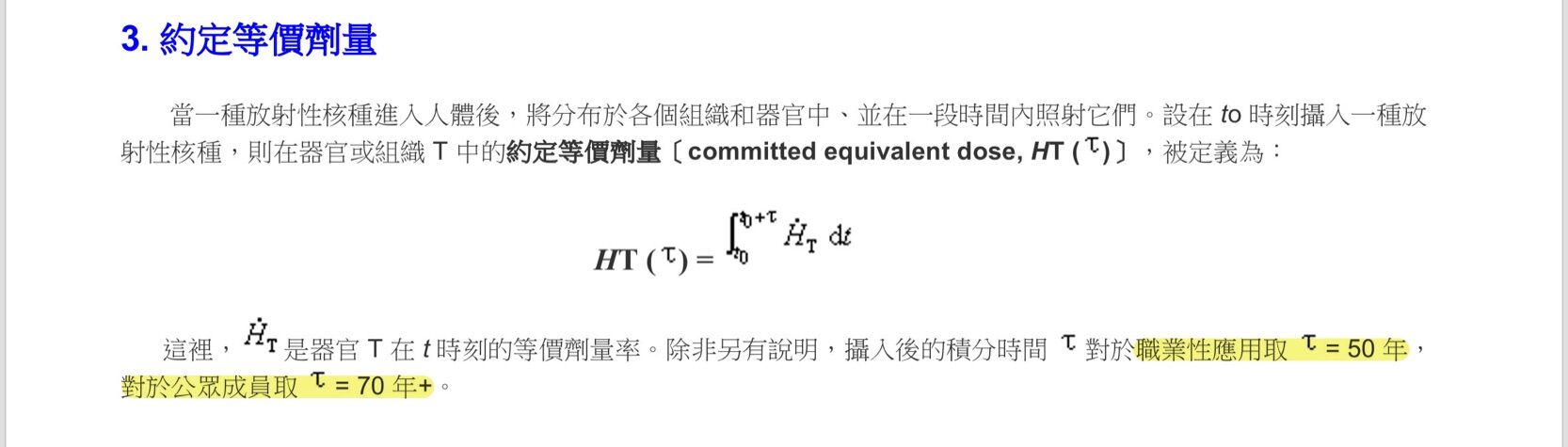 71.約定等效劑量是指單次攝入放射性物質於體內後,在一段時間後對某一器官或組織產生累積之等效劑量,其
