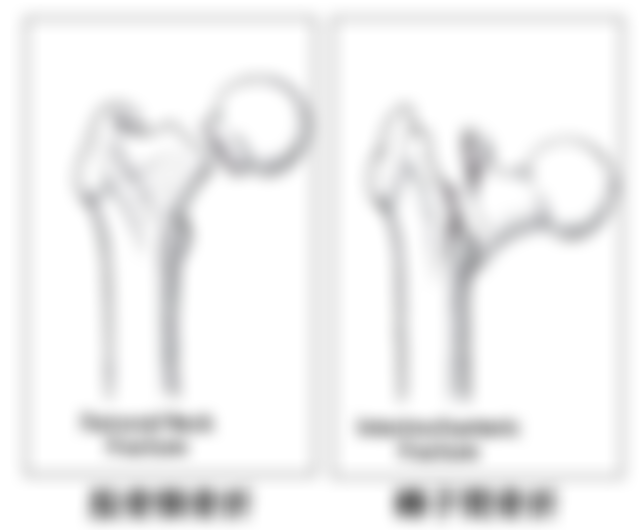 股骨頸(femoral neck)骨折:涵蓋股骨頭下骨折、頸橫骨折以及基底骨折在內的股骨頸骨折,會有血液供應不佳問題。常見於60歲以上成人,且以女性更為常見。