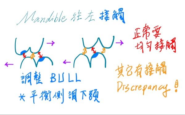頰側咬頭舌側斜面接觸左側下顎頰側咬頭頰側斜面 ②左側上顎舌側咬頭舌側斜面接觸左側下顎舌側咬頭頰 側斜面 ③右側上顎舌側咬頭舌側斜面接觸右側下顎舌側咬頭頰側斜面 ④右側上顎頰側咬頭舌側斜面接觸 右側下顎頰側咬頭頰側斜面