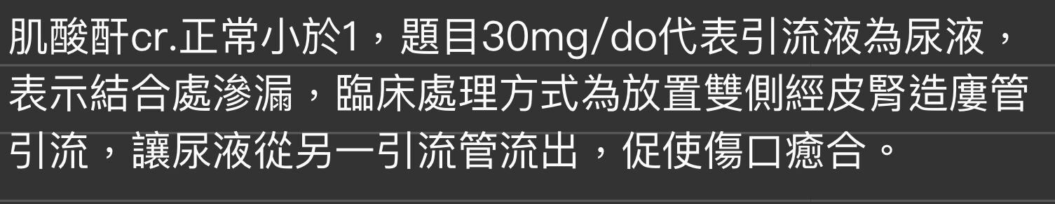 72. 一位60歳男性因膀胱癌接受根除性膀胱切除併迴腸新膀胱手術,術後一週腹腔引流管