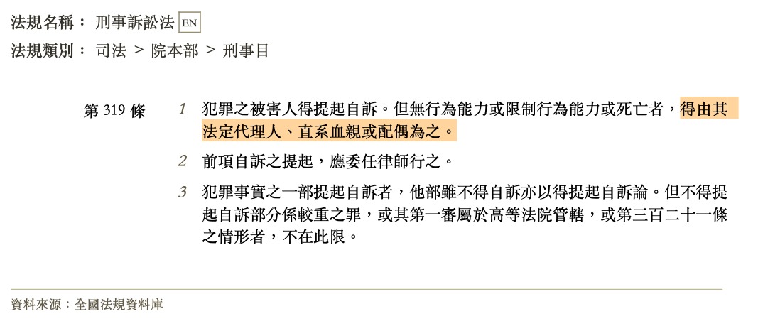 犯罪之被害人得提起自訴。但無行為能力或限制行為能力或死亡者,得由其法定代理人、直系血親或配偶為之。