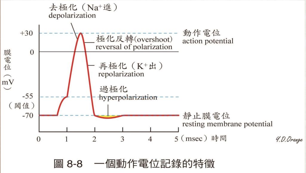 過極化: 鉀通道持續打開,若鉀擴散到細胞膜外太多,超過靜止膜電位(-70)則出現過極化作用