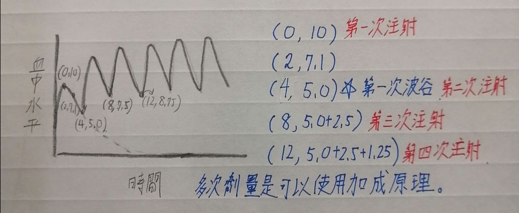 5.同理,如果問第四次注射給藥後的濃度為多少,就是18.75(8.75+10)mg/L。