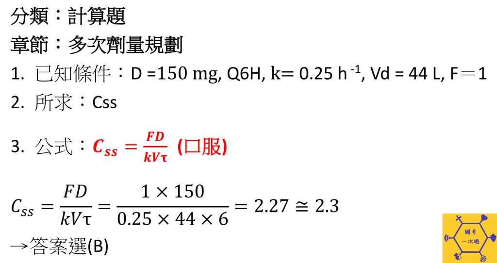 76.王小姐每6小時服用 clindamycin 150 mg 治療感染症,其達穩定狀態血中濃度為若干mg/L?(clindamycin:k=