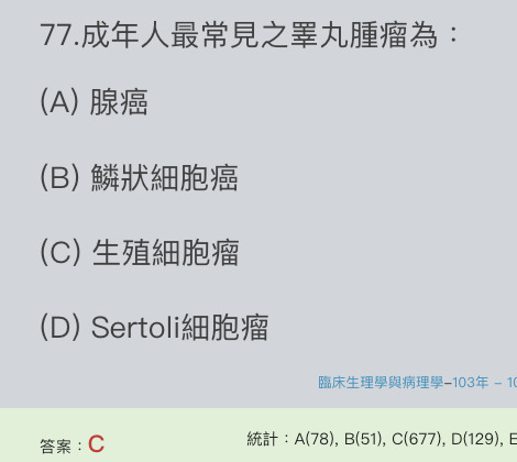 77.下列何者為青春期後最常見之睪丸腫瘤?