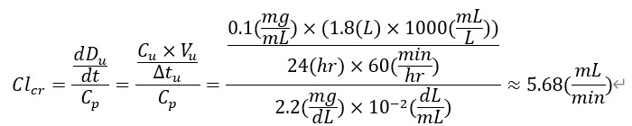 Clcr=100*0.1*1800/1440*2.2=5.68mL/min