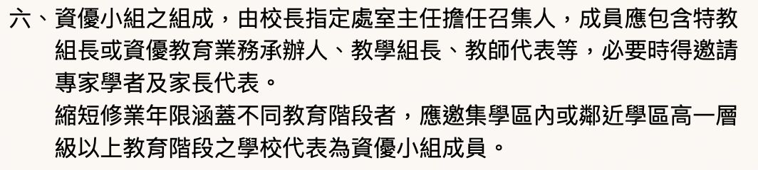 乙、縮短修業年限涵蓋不同教育階段者,應邀集學區內或鄰近學區高一層級以上教育階段之學校代表為資賦優異小組成員