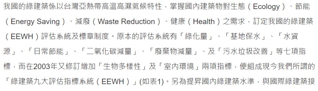 綠化量,基地保水,水資源,日常節能,二氧化碳減量,廢棄物減量,污水垃圾改善,生物多樣性,室內環境等九項