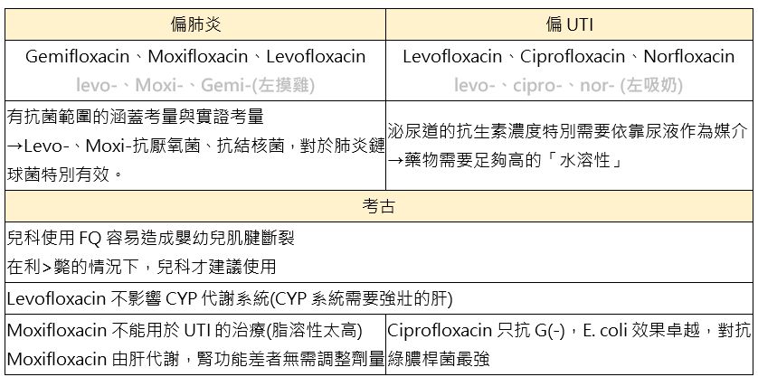 Moxifloxacin肝排、不用於泌尿、不抗綠膿