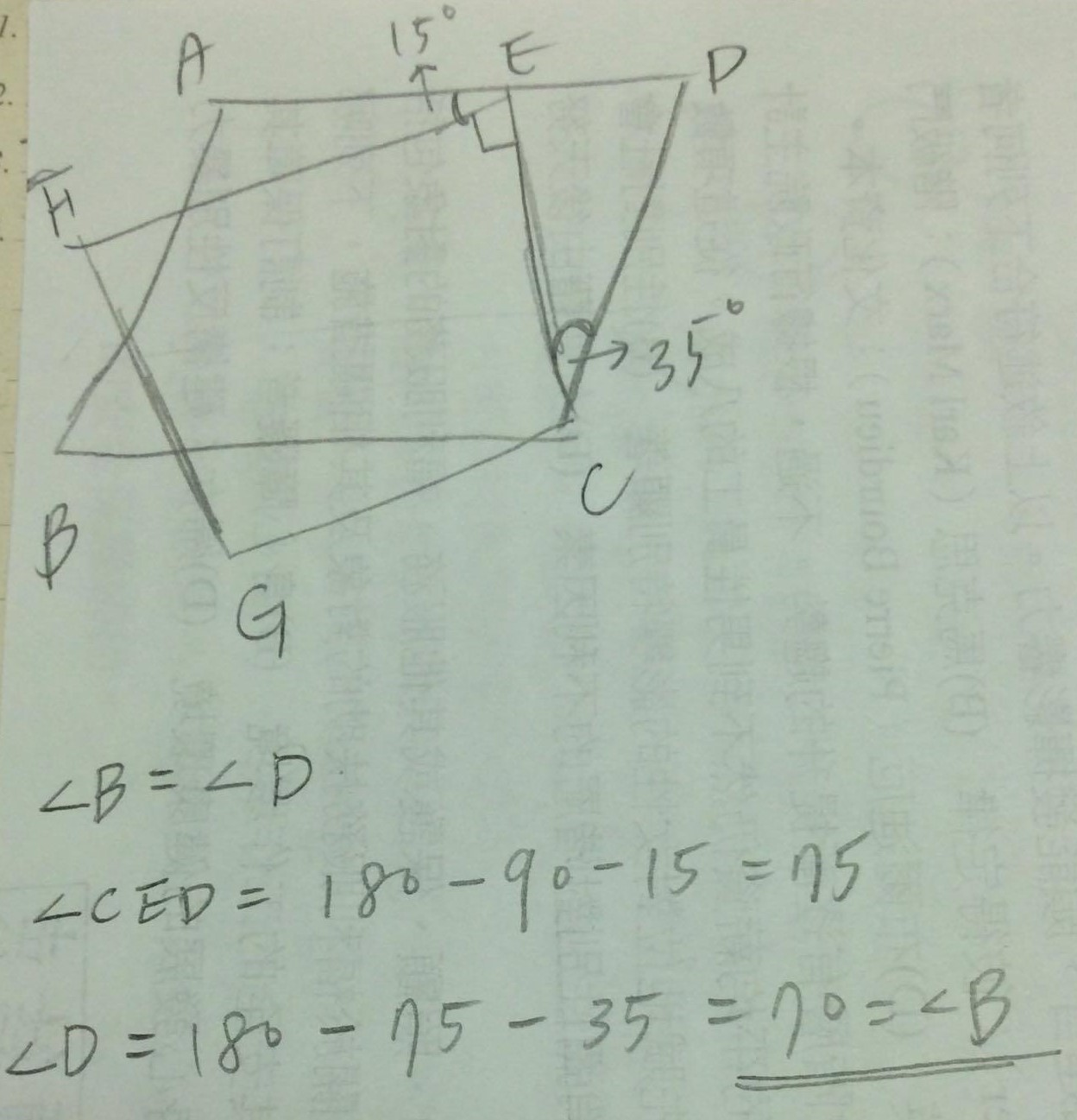 8. 如圖(五),有一平行四邊形 ABCD 與一正方形 CEFG, 其中 E 點在 AD 上。 若 ∠ ECD = 35°, ∠ AEF= 15°,則 ∠ B 的度數為何?