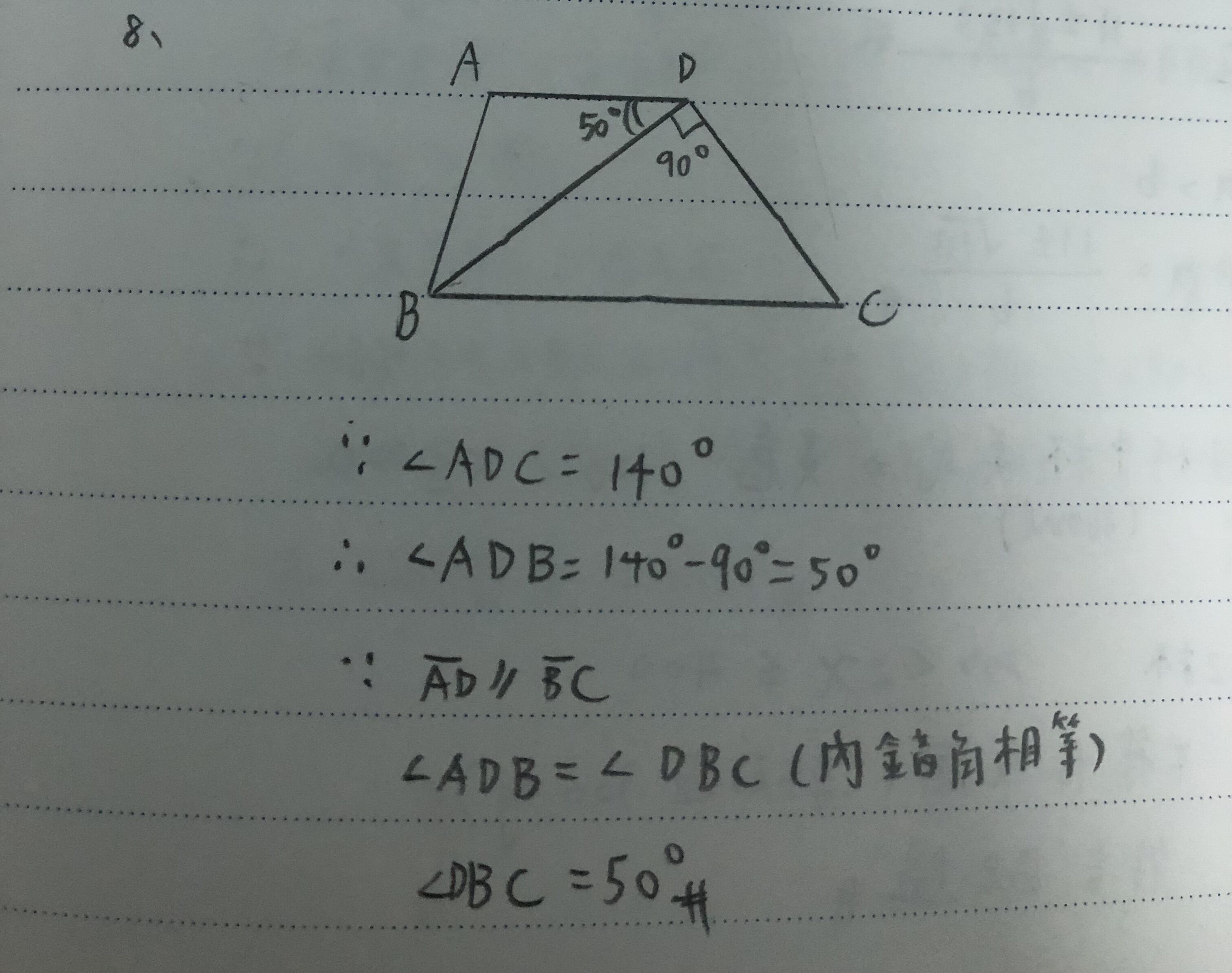 ∠DBC=50度,平行截線內錯角等角。