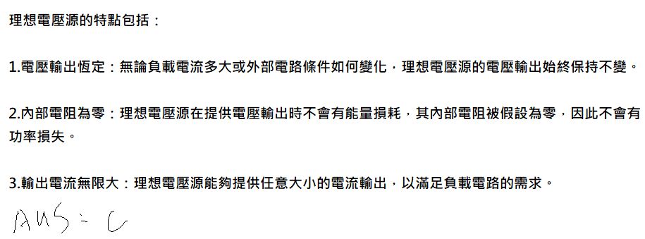 (B) 輸出為電感型:這個敘述是不正確的。理想電壓源並不特定地指定輸出為電感型。它只是提供一個恆定的電壓,無論負載是電感、電容還是其他類型的元件。