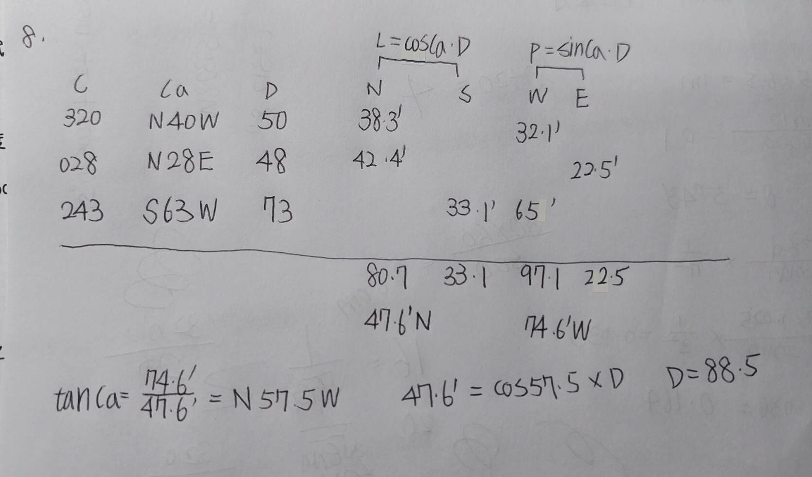 8. 某船依航向320°航行50浬,然後轉向028°航行48浬,最後轉向243°航行73浬。請以聯向航 法(Traverse Sailing)推求該船之實際航行距離(D.M.G.)為幾浬?