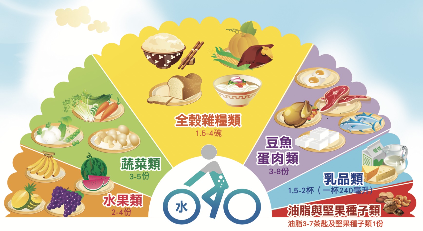 (B) The daily diet guide contains six categories of foods.