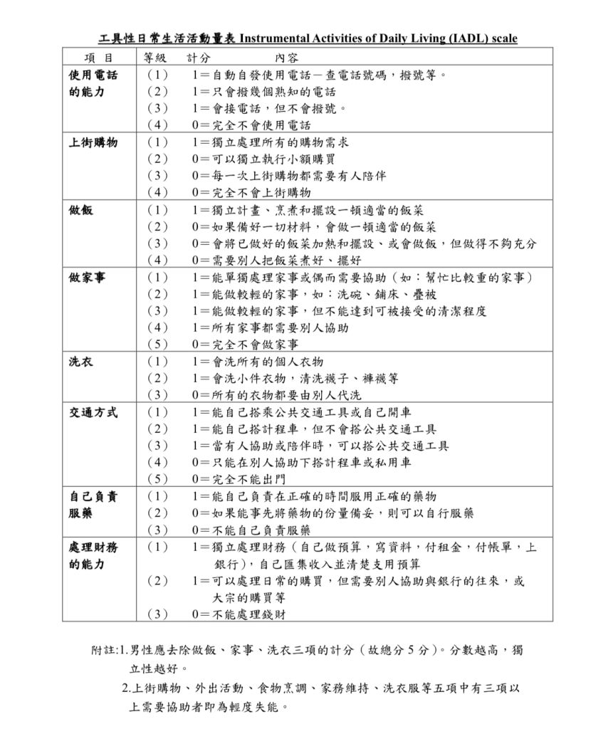 9 「工具性日常生活活動功能」量表(Instrumental Activities of Daily Living, IADLs)是用以評估老人獨立